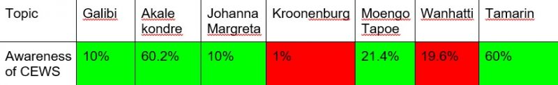 De gemeenschappen leerden allemaal over weer- en getijdenvoorspellingen. Ze kwamen samen om de gemeenschap te informeren over CEWS. Er werden procedures afgesproken om de gemeenschap te waarschuwen. In de gemeenschappen met traditioneel leiderschap werd toestemming gegeven aan de CDRT om ook waarschuwingen te geven en in andere gemeenschappen werd de lokale overheid op de hoogte gebracht. De meest voorkomende waarschuwingsmethode in alle gemeenschappen was de huis-aan-huis-methode. De waarschuwingen worden gegeven in verschillende talen namelijk Nederlands, Sranang Tongo, Sarnami, Javaans, Engels en Kalinha. De simulatieoefeningen waren een geweldige manier om niet alleen praktijk-ervaring te geven aan de CDRT, maar ook om het bewustzijn over CEWS verder te verspreiden. De simulatie maakte Galibi er van bewust dat de lokale bevolking nog steeds meer vertrouwen heeft in waarschuwingen van traditioneel leiderschap dan waarschuwingen van de CDRT. In onderstaande tabel is een samenvatting gegeven van de resultaten van de onderzoeken. De meeste gemeenschappen hebben een toename van het bewustzijn gezien in de gemeenschappen van CEWS. Alleen Kroonenburg en Wanhatti hebben geen verhoogd bewustzijn. In Kroonenburg is de bewustwording ongeveer gelijk aan de uitgangssituatie. Wanhatti zag echter een afname van het bewustzijn. Dit komt door het hoge aantal mensen dat in en uit de gemeenschappen trekt. Beide gemeenschappen hebben meer tijd en moeite nodig om het bewustzijn te vergroten.